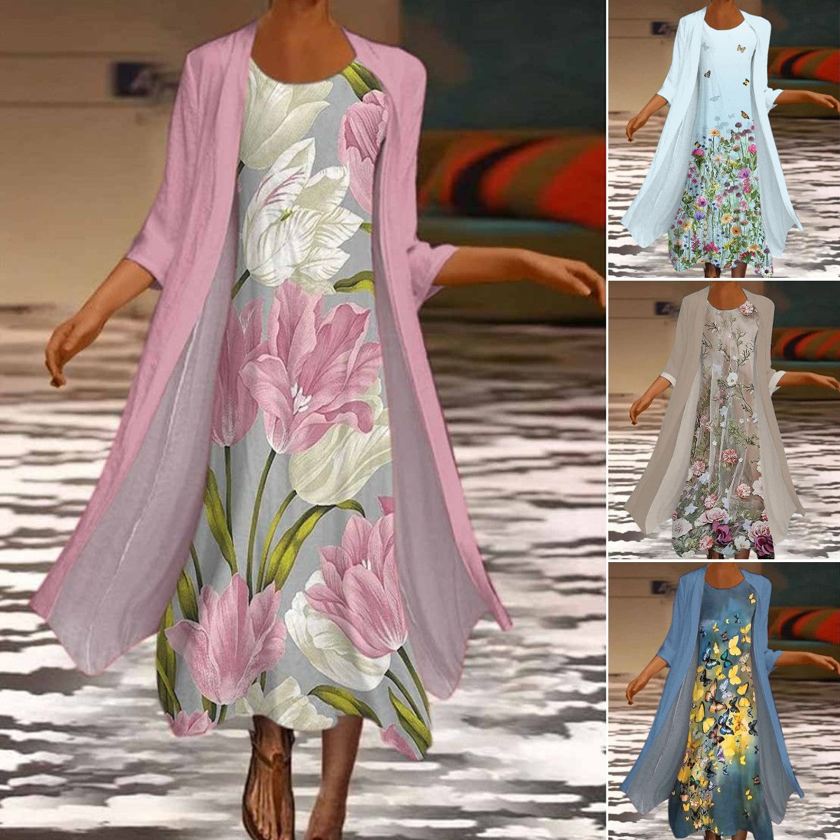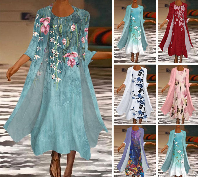 🌻 Zľava -42% 🔥🔥【S-5XL】Nové dámske maxi šaty s kvetinovou potlačou Dvojdielne šaty s okrúhlym výstrihom